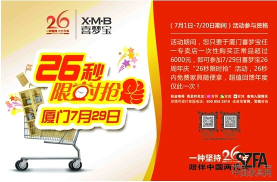 喜夢寶兒童家具”26秒限時搶”活動已經(jīng)開始了,首站定于廈門喜夢寶海滄工廠店舉行。“26秒限時搶”作為喜夢寶兒童家具品牌26周年慶的重頭戲,活動機(jī)制在延續(xù)去年的情況下,時間也從25秒增至26秒。