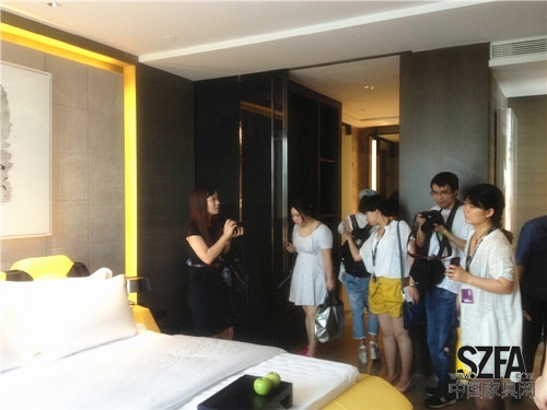 我們主要參觀了酒店大堂,處處有設(shè)計(jì),風(fēng)格強(qiáng)烈的黑白搭配,冷暖色調(diào),大量木質(zhì)的運(yùn)用,滿耳的鳥叫聲,讓人感覺很放松很愉悅。接著前往酒店的最高樓,八樓用餐區(qū)和書吧(其實(shí)是六樓,按廣東習(xí)俗,沒有四樓和七樓,所以順序?yàn)橐欢辶?。)?80度的全景欣賞,可看得到整個深圳中心公園,綠蔭蔥蔥。參觀完八樓后,我們來到了總統(tǒng)套房,總統(tǒng)套房占地180平米,客廳擁有270度廣角的外景,坐享深圳夜景,主臥床采用了蘭博基尼材質(zhì)的定制床,符合人體工學(xué),讓客人睡得舒心。最后參觀的是酒店一樓中餐區(qū),中餐定名為“粵色”,餐廳采用了大量木制材料,極具嶺南特色,而且還有很多創(chuàng)意組合,如算盤取代了屏風(fēng),分割了空間,但疏密有致的空隙又讓空間連貫一體。