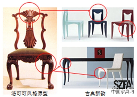 對(duì)于原型模仿而言,相對(duì)比較直接和直觀,無(wú)需贅述。但即便如此,也得緊緊抓住原型中的典型特征。如:路易十四式風(fēng)格家具中最突出的特征是在家具本體的角部與拉手部位有黃金裝飾,另一個(gè)重要的體態(tài)特征是桌椅類家具常用“S”型彎腿。如圖1所示。