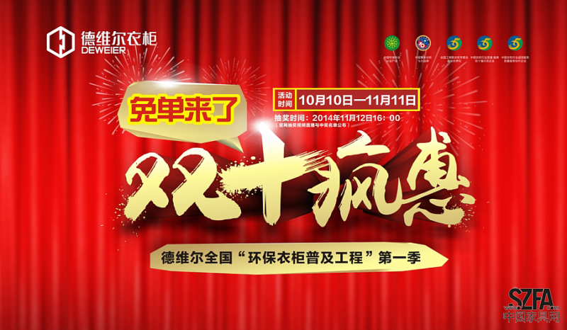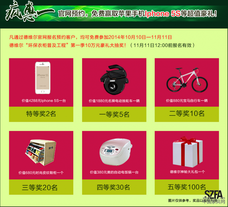 活動(dòng)期間,德維爾官網(wǎng)預(yù)約并登記相關(guān)資料,免費(fèi)贏取iphone5S手機(jī)、品牌電動(dòng)獨(dú)輪車(chē)、寶馬自行車(chē)、名牌電飯鍋等。凡報(bào)名參與活動(dòng)的業(yè)主朋友,均可免費(fèi)參與2014年10月10日-11月11日德維爾“環(huán)保衣柜普及工程”第一季10萬(wàn)元禮品抽獎(jiǎng)活動(dòng):