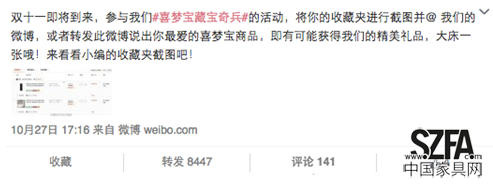 核心提示:青少年兒童家具喜夢寶在雙十一之際,在微博上推出了曬出你的雙十一截圖有獎互動活動,獲得了網(wǎng)友們的一致好評?;顒訁⑴c人數(shù)一再