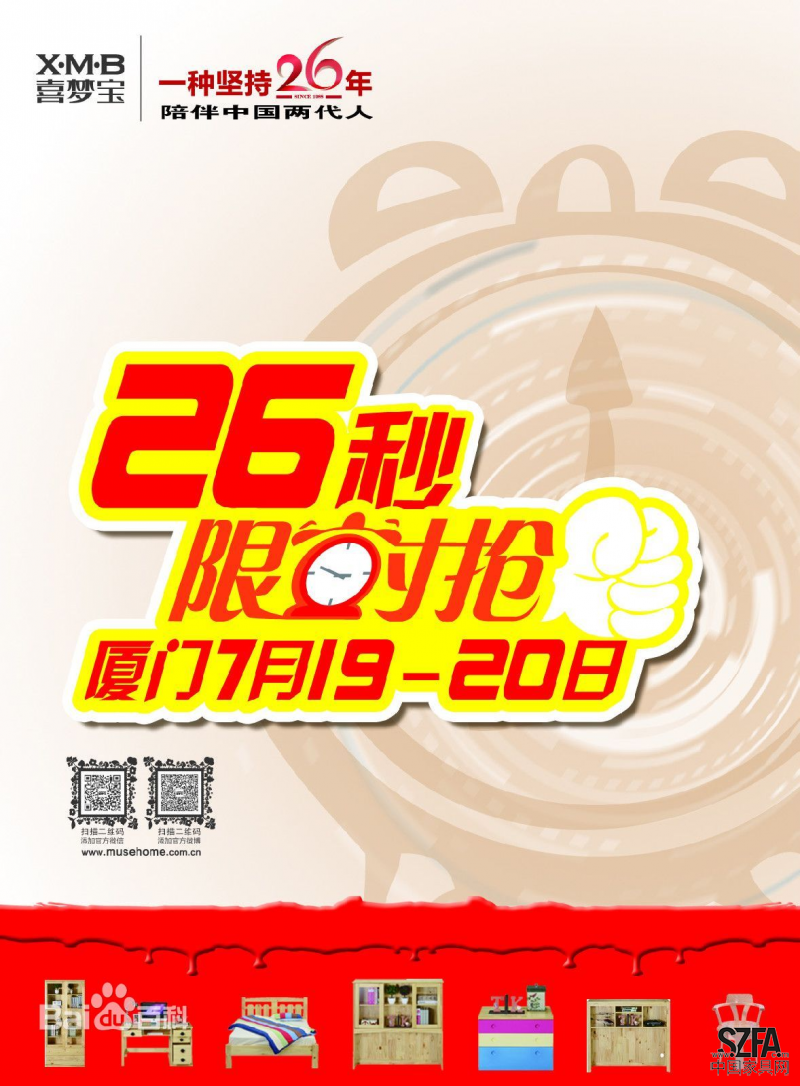 2014年,喜夢寶延續(xù)了上一年引爆全城的“限時搶活動”,繼續(xù)以超大的優(yōu)惠力度來回饋一直支持喜夢寶的忠實顧客們。2014年是喜夢寶的26周年,因此“26秒限時搶”活動在線下門店轟轟烈烈的席卷而來,達到參加標準的消費者只要能在26秒內(nèi)將自己喜愛的家具“搶”出來,就能夠免費擁有它。