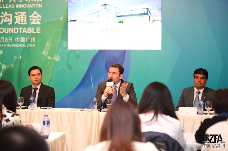 拜耳材料科技涂料、粘合劑和特殊化學(xué)品業(yè)務(wù)部亞太區(qū)高級(jí)副總裁賀福瑞(Samir Hifri)(左二)、大中華區(qū)副總裁鐘小斌(左一)、亞太區(qū)應(yīng)用拓展副總裁(Anand Khot)分享可持續(xù)聚氨酯涂料解決方案最新信息