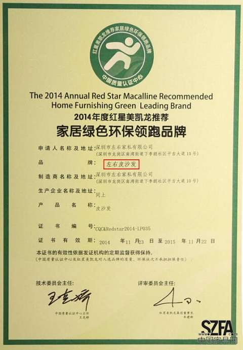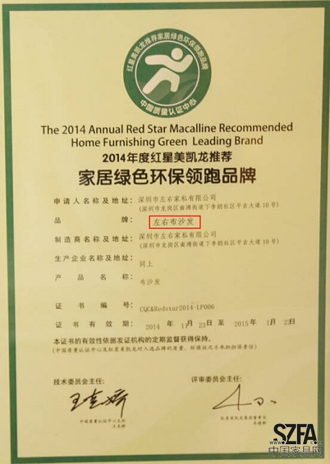 左右家私榮膺“2014年度家居綠色環(huán)保領(lǐng)跑品牌”