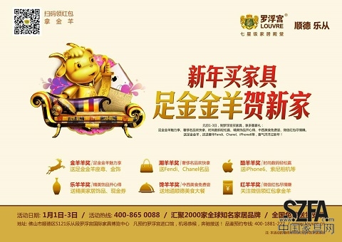 羊年即將到來(lái),羅浮宮家居集團(tuán)將在元月1-3日推出“新年買(mǎi)家具 足金金羊賀新家”大型促銷(xiāo)活動(dòng),奉上百萬(wàn)豪禮回饋市民:8座足金賀歲金羊,還有Iphone6、芬迪Fendi圍巾、香奈兒香水、索尼數(shù)碼相機(jī)等超級(jí)豪華大禮,還可獲贈(zèng)價(jià)值超千元的家居飾品、超值美食券,品嘗地道順德美食,讓客人在購(gòu)物之余暢享舌尖上的盛宴;活動(dòng)期間,所有客戶只要購(gòu)物滿一定金額就可享受大轉(zhuǎn)盤(pán)抽獎(jiǎng)活動(dòng),且所有參與者均百分百中獎(jiǎng)。