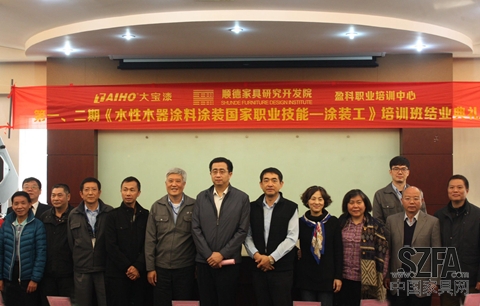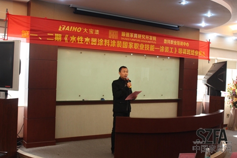 國(guó)家化工行業(yè)生產(chǎn)力促進(jìn)中心王翊民主任、國(guó)家標(biāo)準(zhǔn)出版社王虹主編、廣東省涂協(xié)黃永漢主任、順德涂料商會(huì)胡景釗會(huì)長(zhǎng)、順德家具協(xié)會(huì)會(huì)長(zhǎng)助理麥煥嬌、順德龍江鎮(zhèn)經(jīng)科局胡忠興副局長(zhǎng)、龍江鎮(zhèn)人力資源協(xié)會(huì)副秘書長(zhǎng)麥乾祥、東莞大嶺山產(chǎn)業(yè)科李燦榮主任,安徽大學(xué)吳海平教授、華南理工大學(xué)涂偉萍教授,大寶公司陳春華總經(jīng)理、張正賢副總、28名結(jié)業(yè)學(xué)員及第三、四期學(xué)員代表,部分家具、涂料企業(yè)代表,共近百人出席。