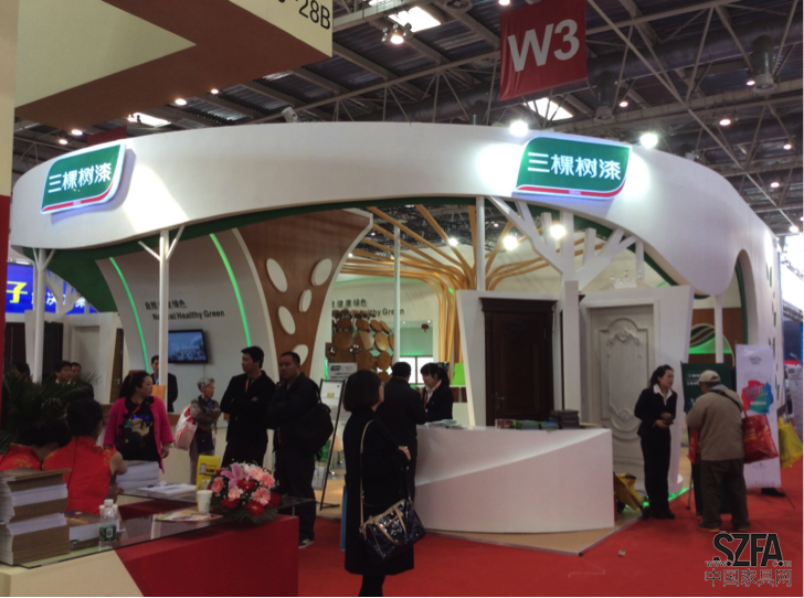 在鱗次櫛比之間,一座造型新穎、清新靚麗的展臺被觀眾所包圍,自然、健康、綠色的環(huán)境表達(dá),專業(yè)、清新、適意的格致服務(wù),給觀眾以“春天來了”的感覺,這就是秉持“道法自然”的三棵樹漆。