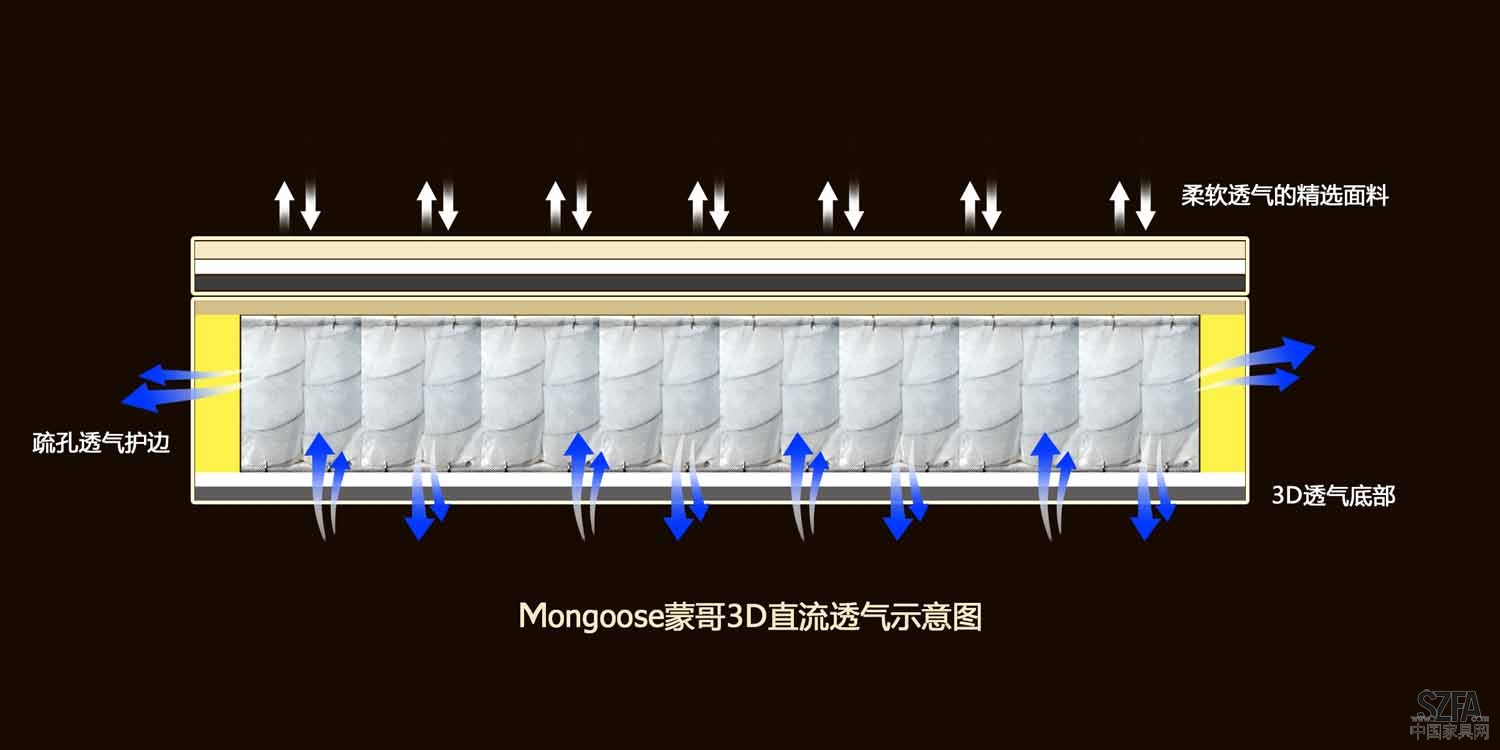 蒙哥獨創(chuàng)的專業(yè)健脊睡眠系統(tǒng),以“3D直流透氣設(shè)計”為核心技術(shù),產(chǎn)品內(nèi)在采用四周疏孔圍邊和通風(fēng)的彈簧構(gòu)造,實現(xiàn)空氣流通“零阻力”,床墊外界與內(nèi)部之間特有的循環(huán)隔斷層,使透氣性遠(yuǎn)遠(yuǎn)超越普通床墊。在彈簧活動下實現(xiàn)內(nèi)外空氣交換、更新,保持清鮮、干爽,真正凈化睡眠環(huán)境。
