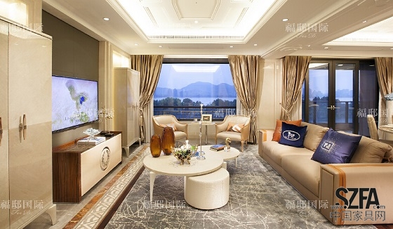福邸國際的設(shè)計(jì)團(tuán)隊(duì)為了打破中式戶型只能配中式家具的刻板印象,以“江山大賞”為主題,靈感搭配其旗下代理的Fendi Casa最新家居新品,以穩(wěn)重不失時(shí)尚的色調(diào)如米金色、灰色等彰顯產(chǎn)品醇厚和生活雍容,實(shí)現(xiàn)了中堂奢華的另一種表現(xiàn)方式。成就了一種致敬世界的中國奢華,也成就了杭州的第一個(gè)FENDI HOME。
