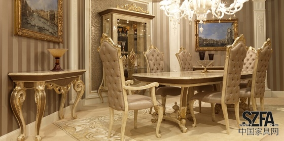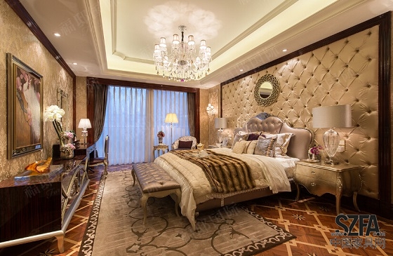 胡桃木飾金的弧形長餐桌為標(biāo)準(zhǔn)的西式餐廳增添了幾分圓融之氣,絲絨餐椅將墻面的色彩和光影完美得過渡到餐桌上來,高踞椅背之上的鎏金飾角靜訴著席間貴賓的顯赫。也唯有這樣迷人的淺紫色才能襯著這氣勢非凡的扣釘軟包墻面,而皇冠造型的床靠和曲線玲瓏的臥榻是主人最私密也最無法割舍的貴族情懷。沿墻而立的妝臺(tái)和依著窗沿的落地?zé)?、休閑椅是福邸的設(shè)計(jì)師融入現(xiàn)代審美和功能需求,以煥然一新的姿態(tài),對(duì)空間做出的最大發(fā)散。