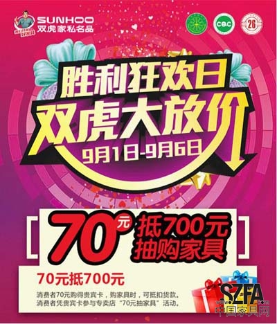 今年是抗戰(zhàn)勝利70周年,為了慶祝這舉國同慶的日子,9月1日—9月6日雙虎家私國慶特惠第一波活動—勝利狂歡日雙虎大放價正式開啟。70元搶家具,還能抵扣700元現(xiàn)金,優(yōu)惠力度相當(dāng)大,活動目的在于向祖國抗戰(zhàn)勝利70周年獻(xiàn)禮,更讓消費者真正意義上的享受到雙虎家私名品帶來的實惠。勝利狂歡日,雙虎大悅賓!