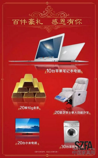 10臺蘋果筆記本電腦、20根10G金條、20套芝華士單人位功能沙發(fā)、20臺小米電視、30臺滾筒洗衣機(jī)百件豪禮