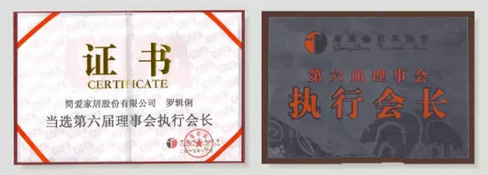 簡愛家居創(chuàng)始人/董事長 羅輯俐女士因其個人對推動廣東省家具/建材專業(yè)連鎖賣場的進(jìn)步所作出的貢獻(xiàn),及其在行業(yè)內(nèi)的影響力和號召力,連任家協(xié)第六屆理事會執(zhí)行會長并獲得“功勛人物獎”;簡愛家居股份有限公司為省家協(xié)第六屆執(zhí)行會長單位為“資深會員”單位。