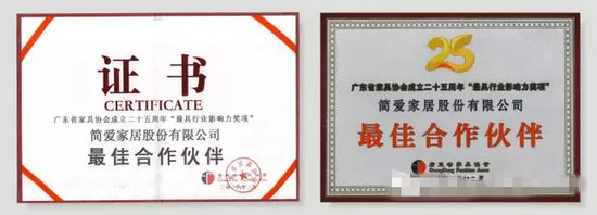 簡愛家居因其開拓性的經(jīng)營理念和前瞻性的營銷模式,為其贏得了行業(yè)內(nèi)較高的知名度與美譽(yù)度,在此次會中榮獲“最具行業(yè)影響力獎項(xiàng)--最佳合作伙伴”。該獎項(xiàng)綜合考量品牌知名度、大眾口碑、行業(yè)創(chuàng)新能力等多方面因素,評選出在行業(yè)內(nèi)中有突出貢獻(xiàn)和具有影響力的品牌。