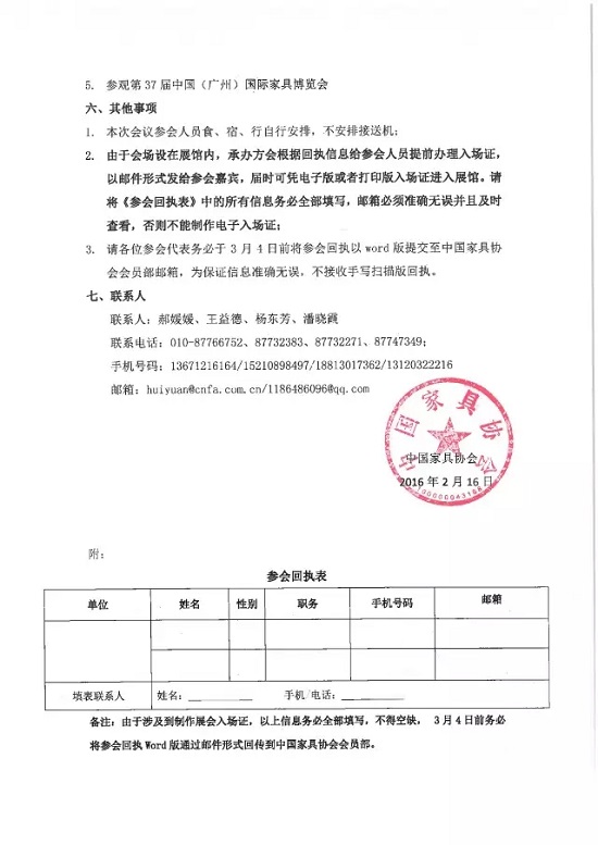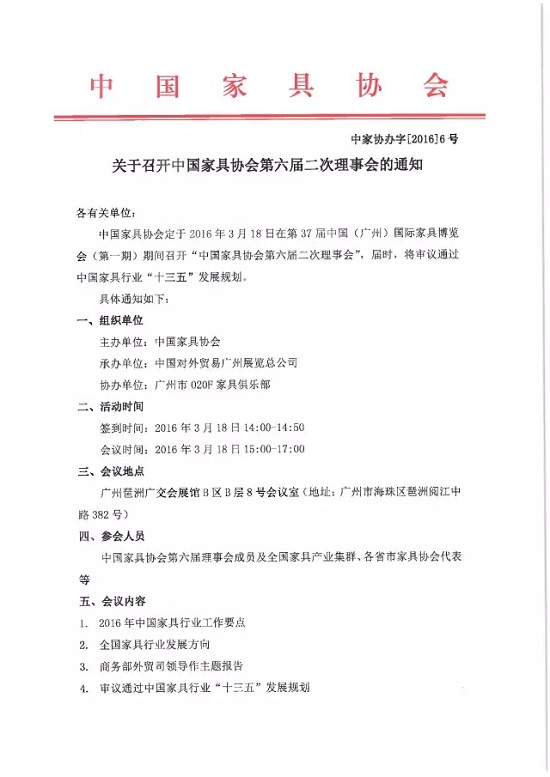 中國(guó)家具協(xié)會(huì)定于2016年3月18日即第37屆中國(guó)(廣州)國(guó)際家具博覽會(huì)(第一期)期間在廣交會(huì)展館8號(hào)會(huì)議室隆重召開(kāi)“中國(guó)家具協(xié)會(huì)第六屆二次理事會(huì)”。屆時(shí),會(huì)議將審議通過(guò)中國(guó)家具行業(yè)“十三五”發(fā)展規(guī)劃。中國(guó)家具協(xié)會(huì)第六屆理事會(huì)成員及全國(guó)家具產(chǎn)業(yè)集群、各省市家具協(xié)會(huì)代表等將出席會(huì)議。