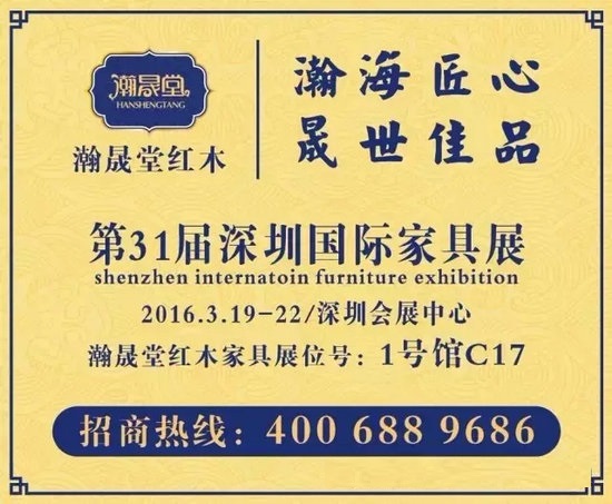 核心提示:3月19-22日,第31屆深圳國際家具展 1號館C17展位。演繹瀚海匠心 晟世佳品。瀚晟堂,新中式紅木家具締造者!誠摯邀約,共享財富!