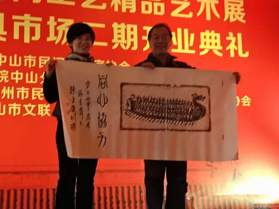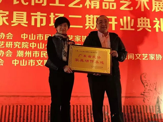 承載更多使命與責(zé)任,中山市民間工藝傳承基地落戶大唐紅木家具市場!由中山市民協(xié)主席李桂山向大唐紅木家具市場副總經(jīng)理方君明授予牌匾。