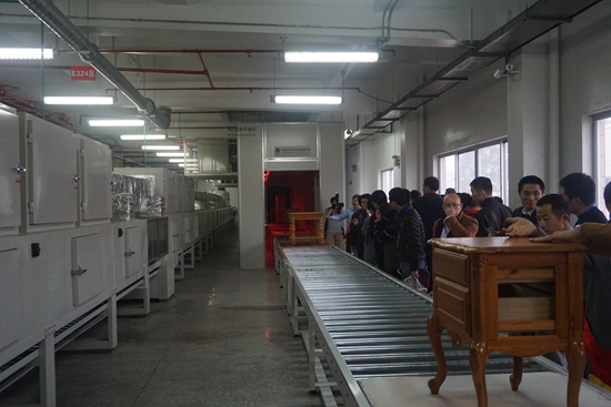 在參觀大寶化工智能涂裝生產(chǎn)線的過(guò)程中,我們發(fā)現(xiàn),大寶智能化涂裝測(cè)試線主要分為:智能傳輸系統(tǒng)、自動(dòng)混氣噴涂系統(tǒng)、吊線水性靜電噴涂系統(tǒng)、干燥系統(tǒng)及污水循環(huán)系統(tǒng)。其中以干燥系統(tǒng)為核心,分為智能微波干燥機(jī)、納米電解干燥劑、電磁波紅外線干燥機(jī)及光固化(UV)干燥機(jī),可以滿足家具廠客戶實(shí)現(xiàn)水性家具涂裝安全、快捷干燥等需求。