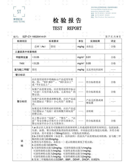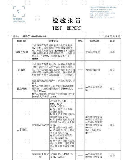 ①單層床:常規(guī)性能:外型尺寸偏差、外觀要求、理化性能要求、木材含水率、結(jié)構(gòu)安全要求、警示標(biāo)示;環(huán)保性能:表面涂層可溶性重金屬、總鉛 表面涂層鄰苯二甲酸酯、木材中五氯苯酚、木材中總砷、兒童家具中整體甲醛釋放量、兒童家具整體總揮發(fā)性有機(jī)化合物。