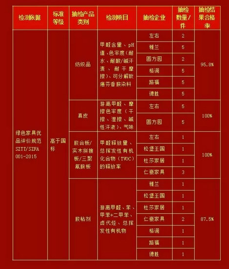 2016年2月底,賽德檢測對“中國綠色家具優(yōu)品”首批獲證四家企業(yè)和第二批五家準入資格進行質量抽檢,本次抽檢全部為原材料抽樣檢測,通過對樣品常規(guī)性能、理化性能及環(huán)保性能的全面檢測,總抽檢合格率接近100%。