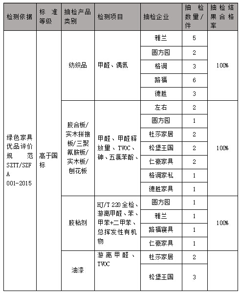 2016年3月,賽德檢測(cè)繼續(xù)對(duì)“中國(guó)綠色家具優(yōu)品”獲證及準(zhǔn)入資格的九家企業(yè)進(jìn)行首季度第三個(gè)月度的質(zhì)量抽檢,經(jīng)過(guò)對(duì)所有企業(yè)原材料的抽樣檢測(cè),總抽檢合格率達(dá)到100%,企業(yè)的產(chǎn)品品質(zhì)持續(xù)提升。