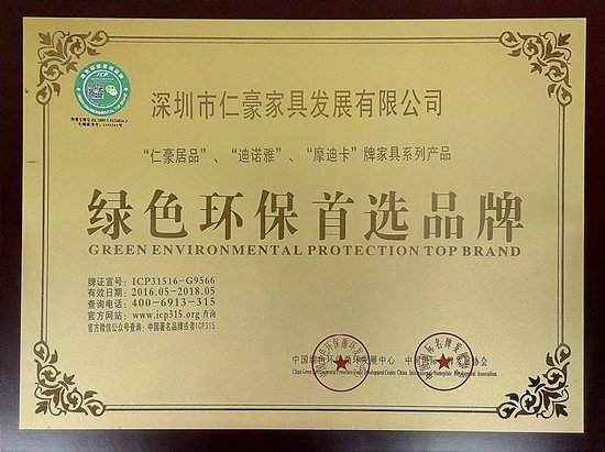 近日,仁豪居品及其旗下品牌迪諾雅、摩迪卡榮獲由中國(guó)綠色環(huán)保循環(huán)發(fā)展中心聯(lián)合中國(guó)國(guó)際名牌發(fā)展協(xié)會(huì)頒發(fā)的“綠色環(huán)保首選品牌”證書,這是繼獲評(píng)“家居綠色環(huán)保領(lǐng)跑品牌”、“中國(guó)綠色家具優(yōu)品”等榮譽(yù)后,仁豪居品在綠色環(huán)保方面獲得的又一重大榮譽(yù)。