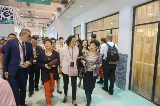 深圳市家具行業(yè)協(xié)會執(zhí)行會長侯克鵬(左)陪同青島貿(mào)促會會長馮文青(右)一行參觀青島國際家具展