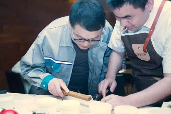 和木生董總(左)和創(chuàng)造空間孫總(右)探討金銀箔工藝