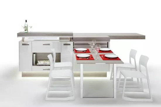 保持整個(gè)空間的整潔性是海福樂(lè)開(kāi)放式廚房的設(shè)計(jì)初衷,整個(gè)廚房在無(wú)需使用的時(shí)候可以隱藏在門板背后,簡(jiǎn)約大方的外觀下隱藏著“亂糟糟”的廚房空間。使用時(shí)可以拉開(kāi)門板,各種廚房餐具應(yīng)有盡有,同時(shí)操作臺(tái)也可以一邊移動(dòng)一邊保持使用狀態(tài),烹飪美味佳肴的同時(shí)可與家人暢快聊天。Hublift拉伸餐臺(tái)讓你在整齊和寬大桌面間自由地?zé)o縫切換:可以將廚房爐灶隱藏起來(lái)保持整潔,拉伸出來(lái)工作區(qū)或用餐區(qū)一點(diǎn)兒不少, 家里來(lái)多幾個(gè)客人也不成問(wèn)題。