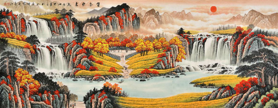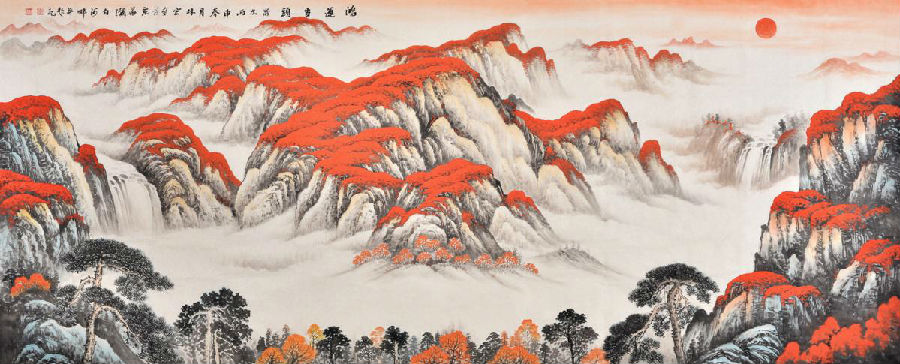 李林宏的這幅《鴻運(yùn)當(dāng)頭》是一幅鴻運(yùn)題材的優(yōu)秀的山水畫(huà)作品。作品構(gòu)圖大氣、渾然天成,用色巧妙,對(duì)比鮮明。祥云漫卷、紅日吉運(yùn),一幅祥和之氣鋪滿整個(gè)畫(huà)面。兩側(cè)溪流從天而來(lái),寓意著財(cái)源不斷,源水長(zhǎng)流。畫(huà)中的大山綿延遠(yuǎn)大,預(yù)示著畫(huà)的主人前程遠(yuǎn)大、潛力無(wú)限。其創(chuàng)作的“鴻運(yùn)”主題風(fēng)水畫(huà)深受各界收藏人士的喜愛(ài),被大家廣泛收藏。這幅作品是辦公室風(fēng)水畫(huà)或居家客廳背景墻最好的國(guó)畫(huà)選擇作品。