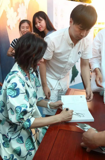 楊恭如坐在柏森家具產(chǎn)品上簽售新書