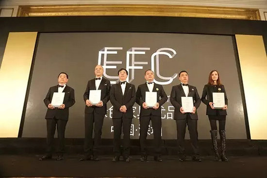 仁豪居品董事長尤國忠(左一)領(lǐng)取“中國綠色家具優(yōu)品”并獲得準入資格證書