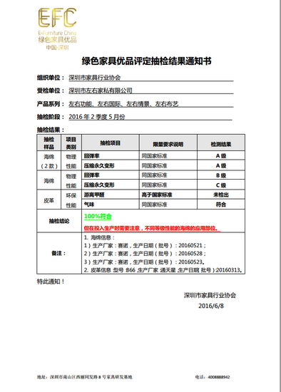為此,左右沙發(fā)更加重視質量管理和品質提升,從原材料品質監(jiān)控到生產制造的每個細節(jié),都追求精益求精。作為中國唯一一家獲得“中國綠色家具優(yōu)品”認證的沙發(fā)企業(yè),左右沙發(fā)積極參與并推動“中國綠色家具優(yōu)品”工作。