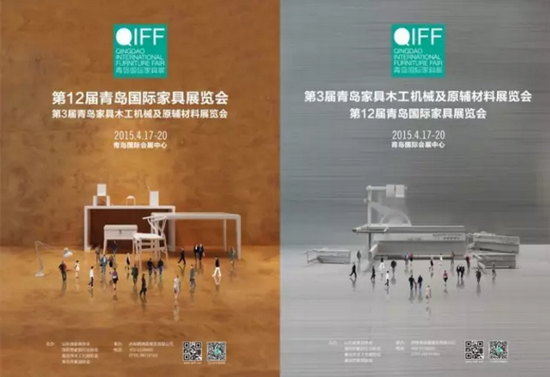 2015年的品牌形象設(shè)計體現(xiàn)了北方家具展和機械展的產(chǎn)業(yè)鏈規(guī)模。使用反向手法,無限放大家具和機械,無限縮小人物,突出QIFF的展會規(guī)模。