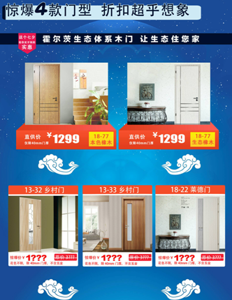 活動期間,3款特價門將以驚爆價格出售,絕對超乎想像。更有今年新款門型給與顧客1299元的特惠價格,本色橡木、生態(tài)橡木兩種花色任選。