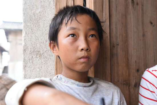 鐘斌,小學(xué)四年級(jí)學(xué)生,性格孤僻封閉,不愛說話,也不愛與人交流。他黝黑的面龐,眼神飄忽不定的,全然沒有同齡孩子應(yīng)有的天真與爛漫。由于干農(nóng)活的關(guān)系,身上的衣服渾身沾滿泥土和灰塵,這就是鐘誠的生活常態(tài)。