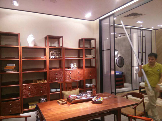 前后的對比度是不是很明顯呢?在我們照明行業(yè)有一句話是這樣說的:調(diào)光是整個(gè)燈光設(shè)計(jì)中的畫龍點(diǎn)睛之筆。調(diào)光前,展廳中燈光沒有重點(diǎn),燈光亂射,調(diào)光后,燈光有重點(diǎn),國壽紅木特點(diǎn)突出,燈光作為一個(gè)無形的導(dǎo)購,把目光吸引到最美的地方。