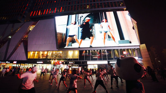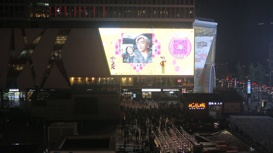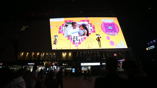 晚上8點左右,伴著《Sugar》的“甜蜜快閃”,舞者們向路人派發(fā)傳單,通過掃描二維碼,路人們紛紛進入“維愛刷屏”互動,無數(shù)情侶、夫妻的親密合照,迅速登陸春熙路兩塊戶外大屏,開始填充屏幕中的愛心,一發(fā)不可收拾。
