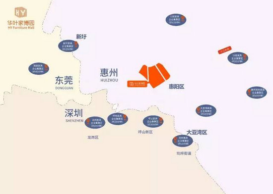 在深莞惠城市格局中,華葉家博園對周圍家具企業(yè)的輻射與集聚效應(yīng)顯著。華葉家博園距深圳坑梓家具企業(yè)集聚區(qū)約15分鐘車程,距坪山、坪地家具企業(yè)集聚區(qū)約20分鐘車程,距龍崗家具企業(yè)集聚區(qū)約25分鐘車程,距清溪家具企業(yè)集聚區(qū)約45分鐘車程;距離惠州三和家具企業(yè)集聚區(qū)約15分鐘車程,距新圩、大亞灣、惠州其他家具企業(yè)集聚區(qū)約20分鐘車程,距惠州沙田家具企業(yè)集聚區(qū)約25分鐘車程。據(jù)不完全統(tǒng)計,在華葉家博園周邊20公里半徑內(nèi),已經(jīng)聚集了超過3000家家具企業(yè),深莞惠家具產(chǎn)業(yè)匯聚效應(yīng)顯現(xiàn)。