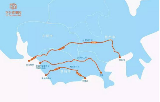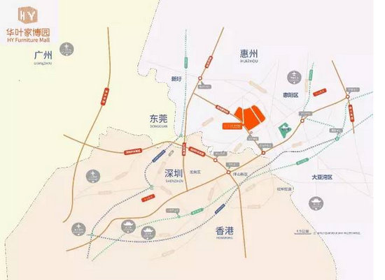 華葉家博園坐落深惠雙城中軸線上,交通便利,連通四大機場:深圳寶安機場、香港機場、廣州白云機場、惠州機場;四大港口:蛇口港、鹽田港、惠州港、香港港;四大軌道交通樞紐:京九鐵路、惠澳鐵路、廣深鐵路、廈深鐵路;以及五大高速貫通:廣惠高速、惠鹽高速、惠莞高速、深汕高速、惠河高速??焖俚诌_深圳、東莞、廣州及佛山等家具產(chǎn)業(yè)重要區(qū)域。