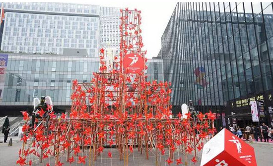 只要巧妙布置,在有限的空間中,色彩與空間展示就能碰撞出別樣的火花。在Fanmost展位里,一個色彩繽紛的波普風藝術裝置特別惹人注目,數(shù)十個彩色風箏被安置于草坪上,且巧妙地利用了玻璃的折射面,營造出寬敞的視覺效果。
