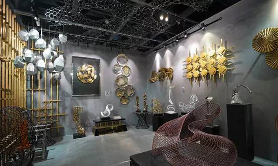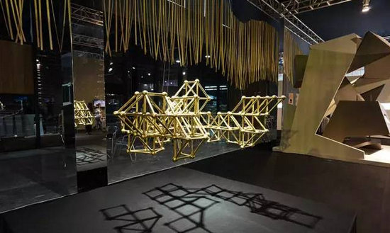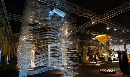 在“心+設計學社”展位里,擺放著12位設計師各自帶著對東方文化的理解和感悟而制作而成的充滿東方美學與中國文化的展品。圖中是邱春瑞大師以點線為基礎設計而成的作品,通過視覺轉(zhuǎn)換呈現(xiàn)出不一樣的空間效果,搭建成一個充滿生命變化,時間變化的空間。