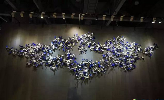 在不同的環(huán)境中,藝術裝置能表現(xiàn)出不一樣的形態(tài)特點。這面蝴蝶墻,用藍白二色的蝴蝶堆砌出形狀,看似隨意,但其實是設計師煞費苦心制作的。燈光亮起,金屬蝴蝶折射出迷人的光線,吸引眾多現(xiàn)場觀眾。