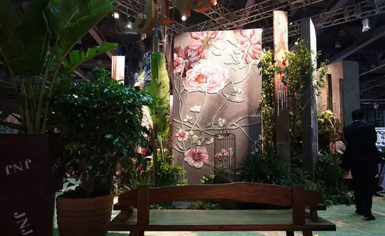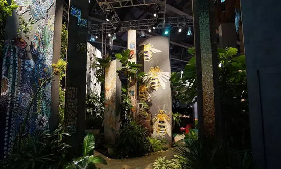 通過與不同元素的搭配,綠植也能襯托出不同的主題。JNJ馬賽克品牌主管潘小姐介紹,他們今年的布展主題是“工匠精神”,用馬賽克鑲嵌的手法呈現(xiàn)出一幅美輪美奐的森林景觀,向大眾表現(xiàn)出不拘形式,不拘材料的馬賽克鑲嵌工藝的無限可能性,同時,也是對今年紅棉獎工匠精神致敬。