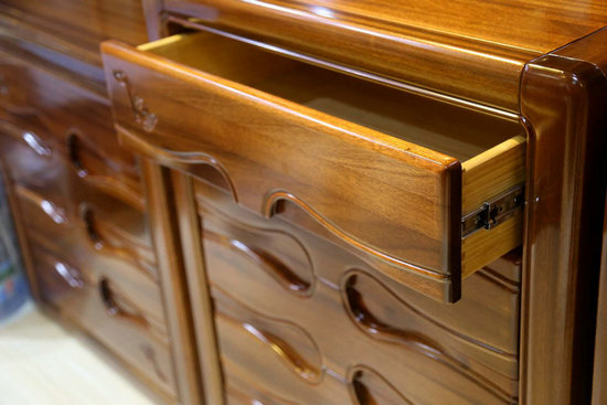 當(dāng)然,尚藝佳也并沒讓我們失望,即使選擇如此優(yōu)質(zhì)的金絲楠木作為家具制作的原材料,他們也沒有持寵生嬌,反而全體員工更加注重精工細(xì)磨,比如每次打磨都用4-5種從粗到細(xì)不同規(guī)格的砂紙,反復(fù)打磨直到光滑閃亮。我在想,在他們心中,家具就像完美情人一樣神圣:能讓人們聽到這樣一個(gè)故事,就會(huì)無比向往遇見這件家具,即使不能擁有,也會(huì)心中泛起漣漪。