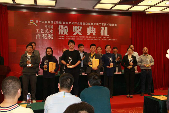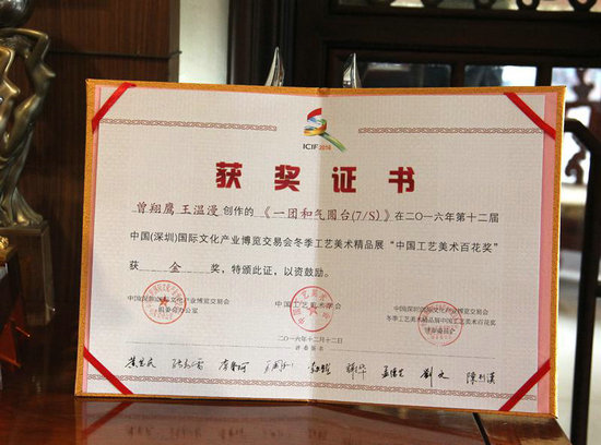 2016年12月12日,第12屆文博會冬季工藝美術(shù)精品展“中國工藝美術(shù)百花獎”頒獎典禮在深圳會展中心舉行。經(jīng)評審,祥利集團《一團和氣圓臺)獲金獎,祥利集團《富貴牡丹梳化》獲銅獎。