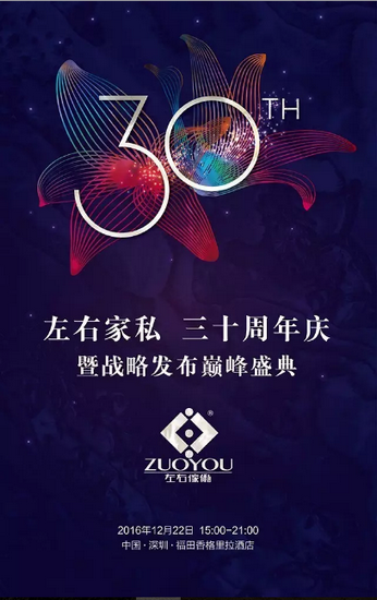 恰逢左右家私發(fā)展30周年的重要節(jié)點,2016年12 月 22 日,一場主題為“一個時代 由此開啟”的左右家私三十周年慶暨戰(zhàn)略發(fā)布巔峰盛典即將在深圳福田香格里拉拉開序幕,作為承啟左右家私全新時代的盛典,耀世矚目的亮點自然毋庸置疑。