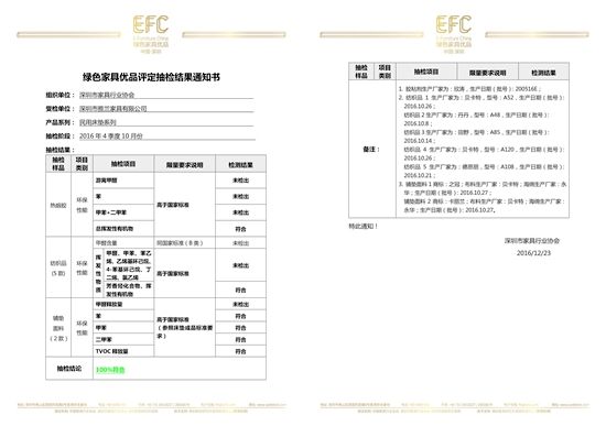 12月23日,中國(guó)綠色家具優(yōu)品2016年四季度10月份抽檢工作完成,作為中國(guó)家具生產(chǎn)及質(zhì)量管理典范,雅蘭床墊再次取得抽檢合格率100%的佳績(jī),熱熔膠、紡織品、鋪墊面料環(huán)保性能均高于國(guó)家標(biāo)準(zhǔn)。