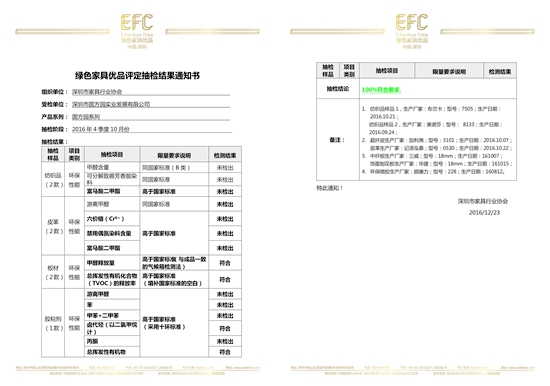 12月23日,中國(guó)綠色家具優(yōu)品2015年四季度10月份抽檢工作完成。作為目前中國(guó)家具唯一參與的軟床企業(yè),圓方園的品質(zhì)受到行業(yè)的高度關(guān)注。經(jīng)過深圳家具研究開發(fā)院檢測(cè)中心賽德檢測(cè)的嚴(yán)格抽檢,圓方園10月份原輔材料抽檢合格率100%,不負(fù)眾望。