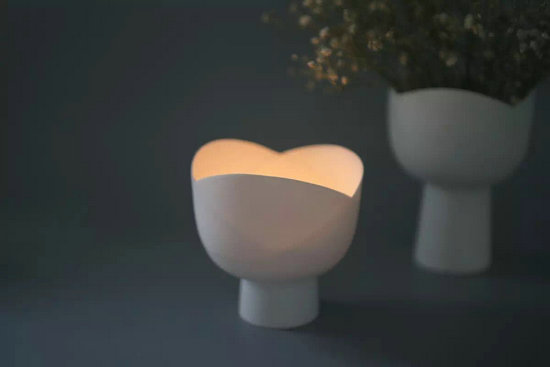 旻佳特別欣賞墨西哥舞娘裙擺舞動的美態(tài),她用一種注漿的方式把這種美傳遞到了陶瓷上,燒制而成“舞動的燈”。